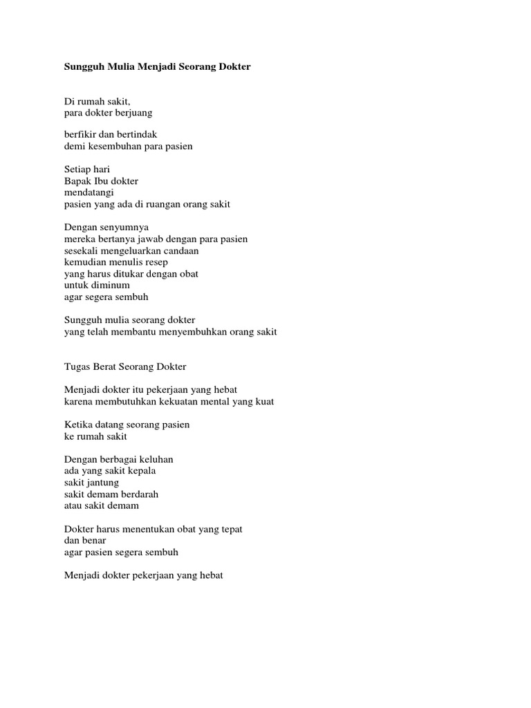 12 september 2018 in galau tentang luka puisi norman adi satria 12 9 september. Menjadi dokter itu pekerjaan yang hebat karena membutuhkan kekuatan mental yang kuat. Dokter itu orang pintar Selalu belajar dengan rajin Tak pernah malas-malasan Hatinya baik membantu insan.