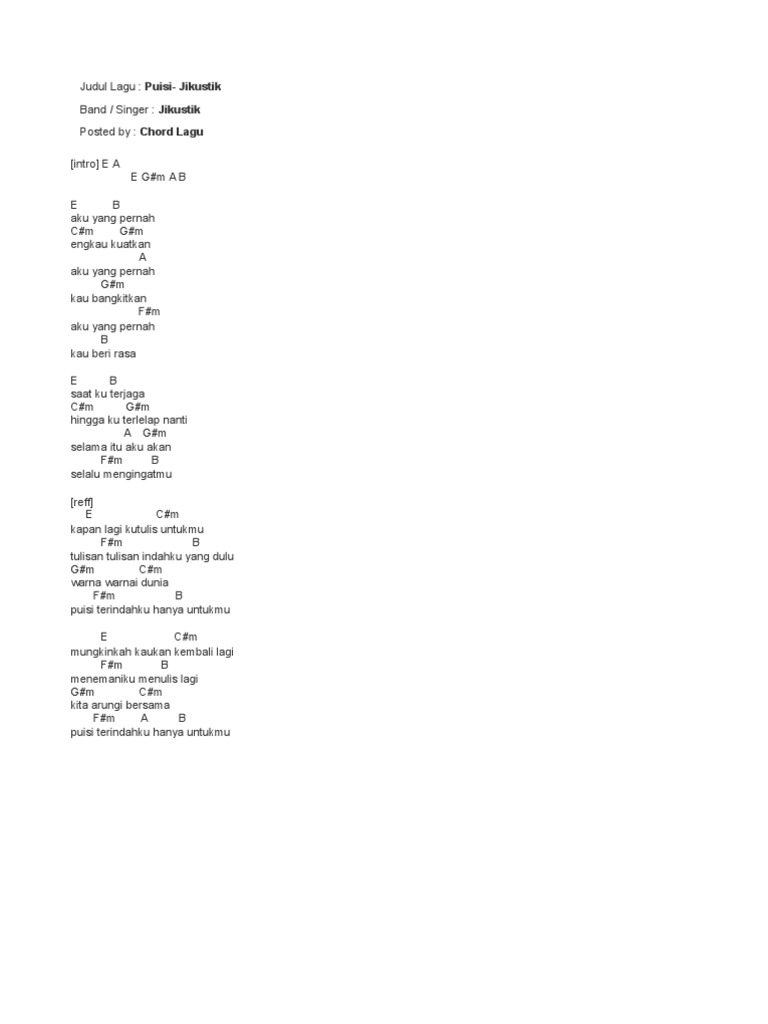 Lirik dan Chord Lagu Setia dari Jikustik Berikut lirik dan chord lagu Puisi. The Lyrics for Puisi by Jikustik have been translated into 1 languages. By nadie az On Thu 13 2012 2243344 views.