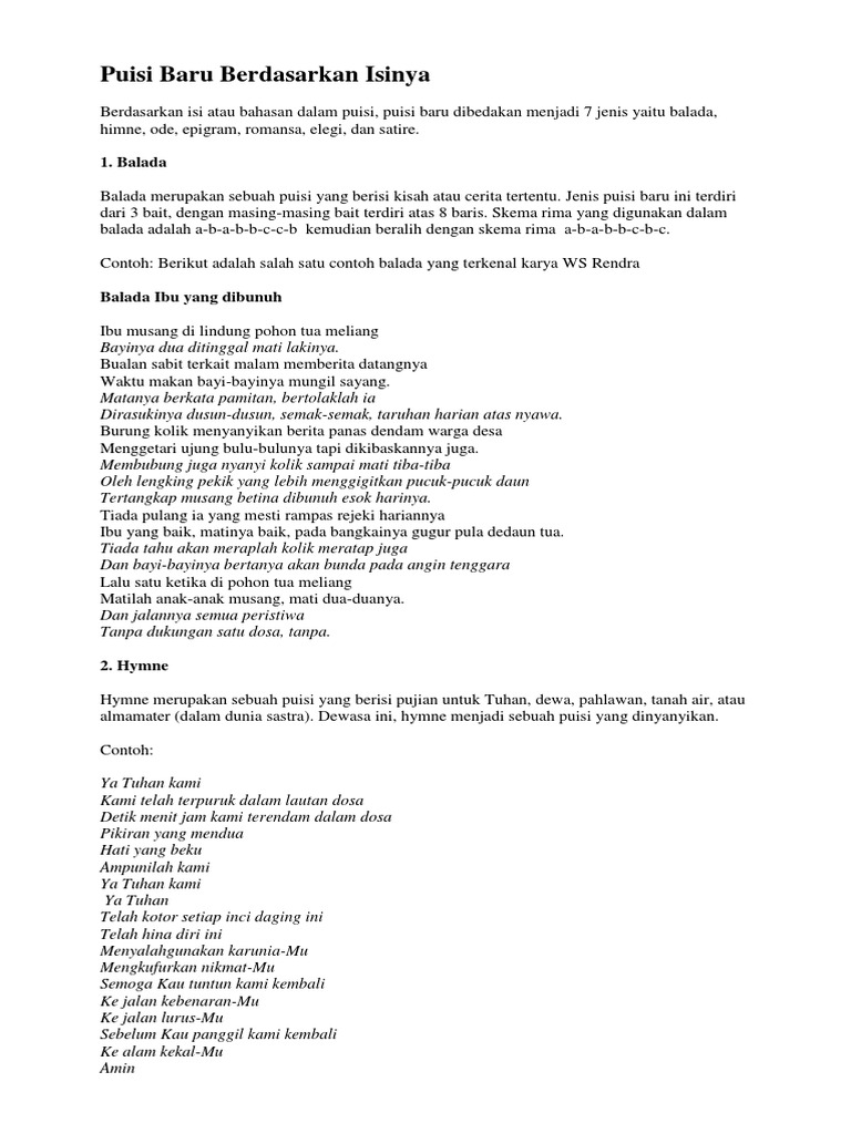 Namun secara garis besar dapat dibagi berdasarkan isinya dan juga berdasarkan bentuknya. Berdasarkan isi atau bahasan dalam puisi puisi baru dibedakan menjadi 7 jenis yaitu balada himne ode epigram romansa elegi dan satire. Pembungkus yang berjasa penuh kisah bertulis duka lara.