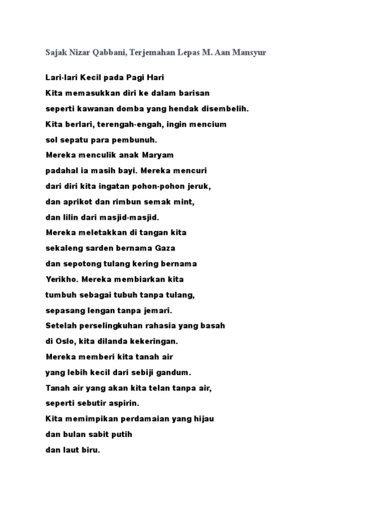 Isi Kuisnya dan Raih Hadiahnya. Nizar Qabbani lahir di Damascus 21 Maret 1923 30 April 1998. Puisi-puisi di atas diterjemahkan dari 4 buku puisi Nizar.