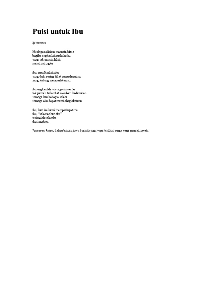 Makna yang ada di hari ibu sangatlah berarti dan bermakna. Puisi ibu dapat kita tulis dengan Bahasa Indonesia Bahasa Inggris Bahasa Jawa dan bahkan Bahasa Sunda. Sebab kasih ibu adalah hal yang terlalu indah untuk diungkapkan dengan kata-kata.